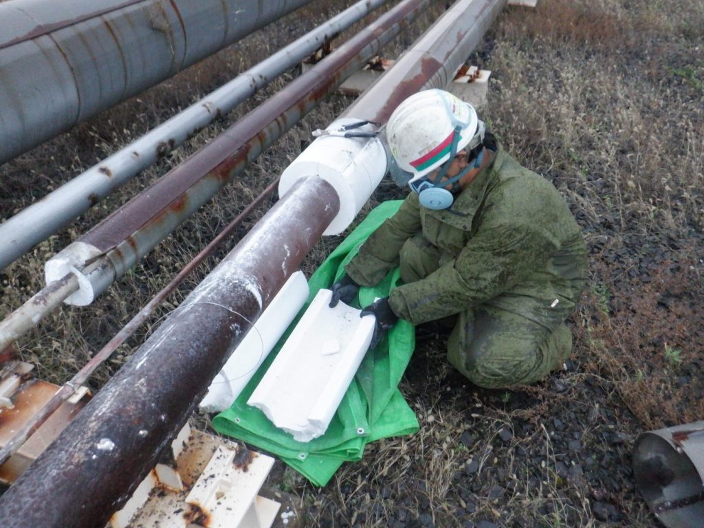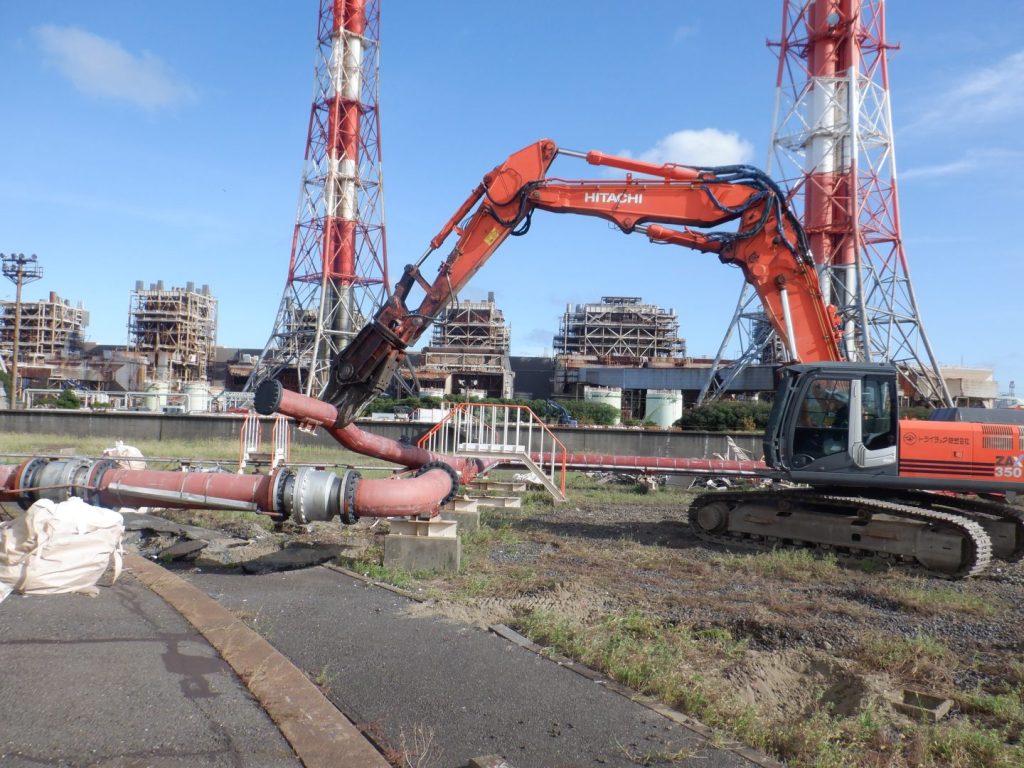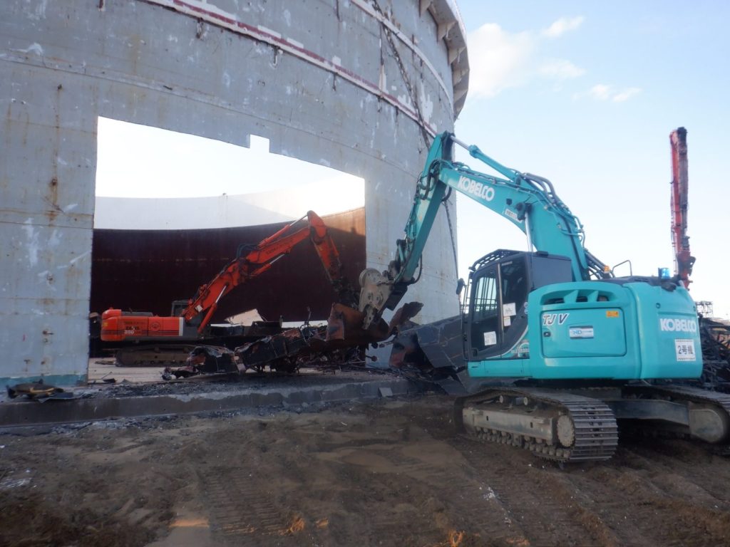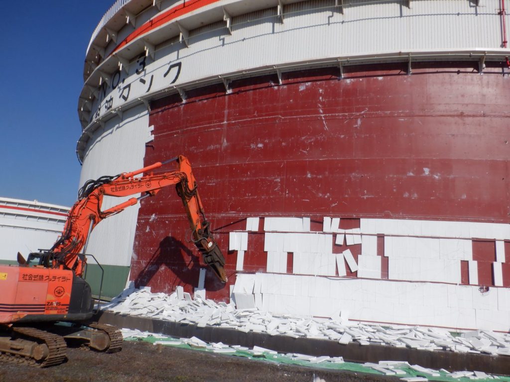 直径61m×高さ21mの浮き屋根タンク6基と、これに付随する配管等設備を対象とした解体工事です。保温材の除去は重機を使用して実施し、高所作業を極力減らすことで、墜落リスクの低減を図りました。