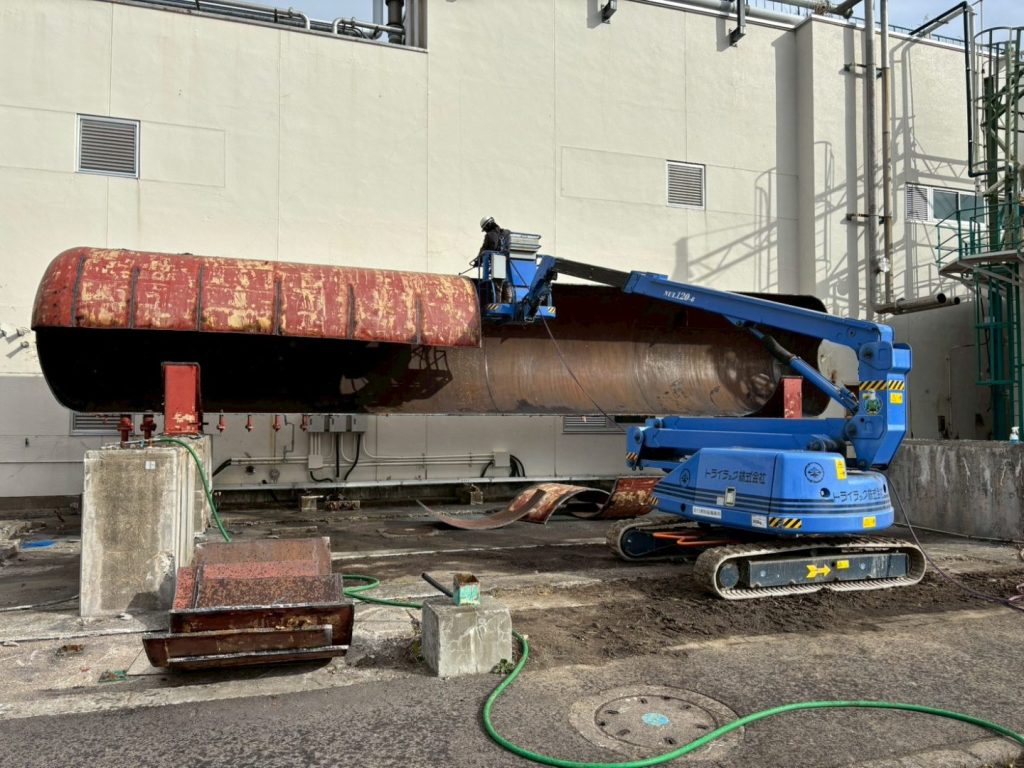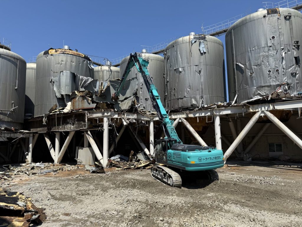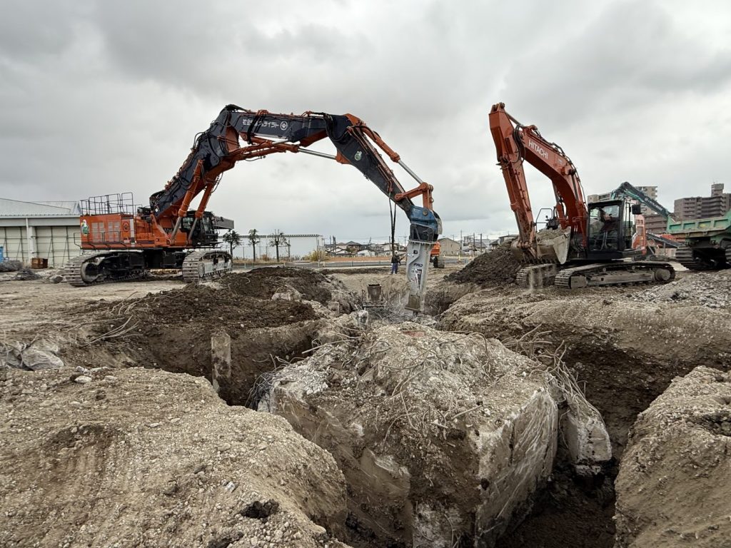 また、180tクラスの大型バックホウを導入し、条件の厳しい解体工事にも対応可能な体制を構築しています。高さ36mのコンクリート製サイロや、厚さ2mを超える設備基礎についても、効率的な解体が可能です。